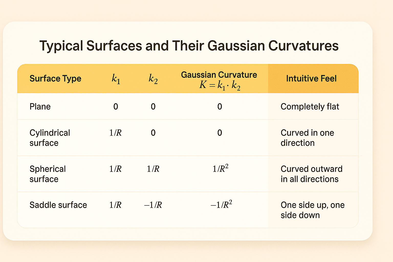 In math, if a smooth surface has Gaussian curvature K = 0 everywhere, we call it a developable surface. In simple terms, it’s the kind of surface you could flatten perfectly onto a sheet of paper without stretching or tearing.