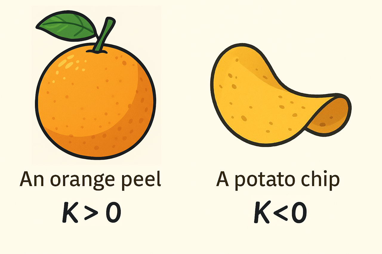 - Orange peel: it curves in every direction ($K > 0$), which is why it can never lie flat.